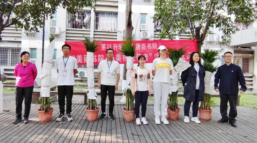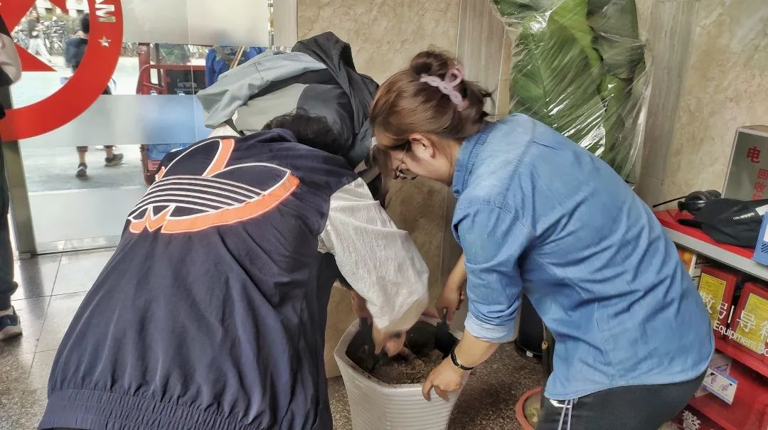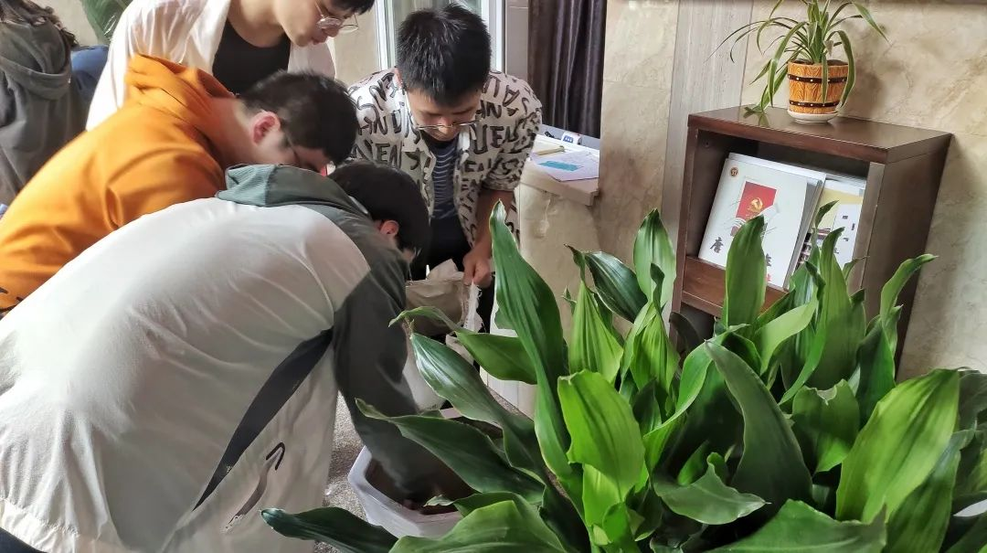 师生情谊的见证。最后,同学们和老师们一起将绿植种植下去,同学们先将花盆里的旧土铲松,放入营养土,再小心翼翼的将植株移植到盆里并填好土,最后在认领的绿植上挂上介绍和寄语卡片。每组同学互相协作,用一盆盆绿植让书院环境焕然一新,生机盎然。