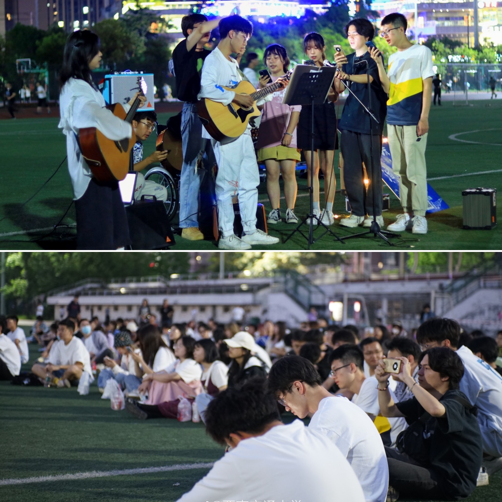 我们是最耀眼的瞬间,是划过天边的刹那火焰,我们点燃了心中的热情,也点亮了五四青年节的天空。演唱会在十点缓缓收尾,承唐歌友会的首秀让师生们意犹未尽。这一个夜晚,天边的晚霞与弯月记得,操场上的夜灯与晚风记得,都是最深刻的独家记忆,最后,音乐万岁!青春万岁!祖国万岁!期待承唐歌友会的下一次精彩演出!