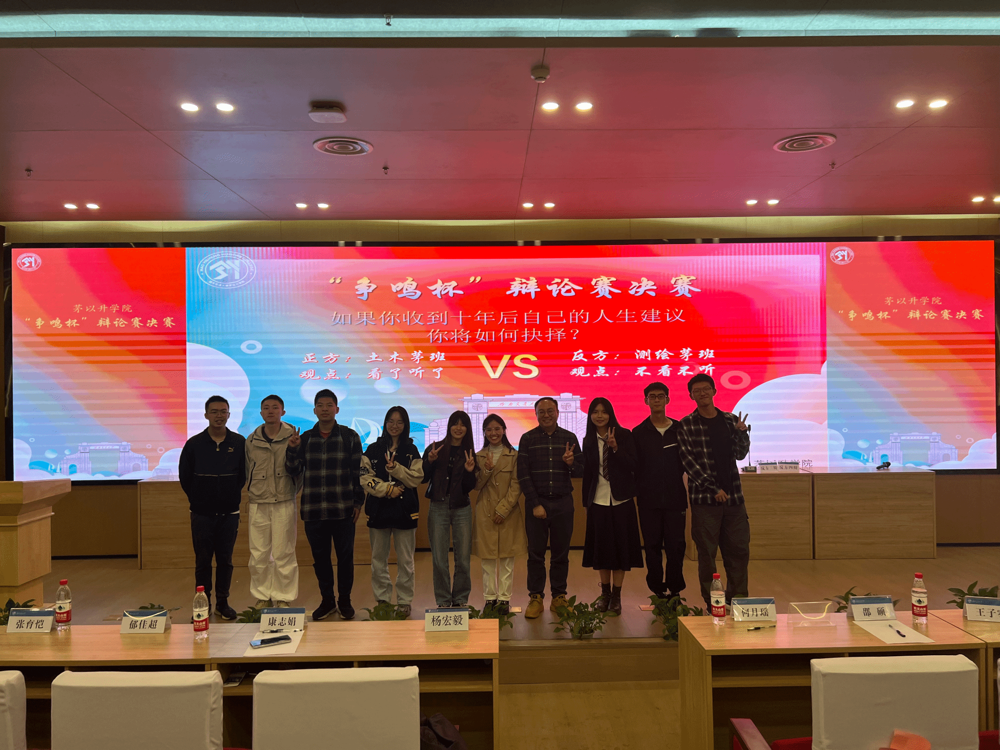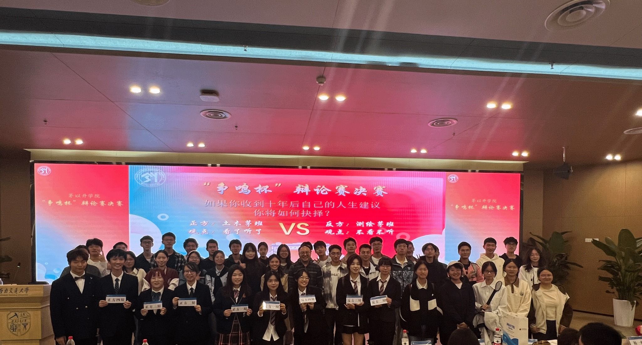 “争鸣杯”辩论赛历经两个月的激烈角逐,经过初赛、复赛和半决赛的层层筛选,最终由正方2024级土木工程专业茅以升班代表队与反方2024级测绘工程专业茅以升班代表队脱颖而出,会师决赛。决赛辩题为“收到十年后自己的人生建议,自己选择会听会看还是不听不看”,双方辩手围绕这一议题展开了激烈的辩论。
