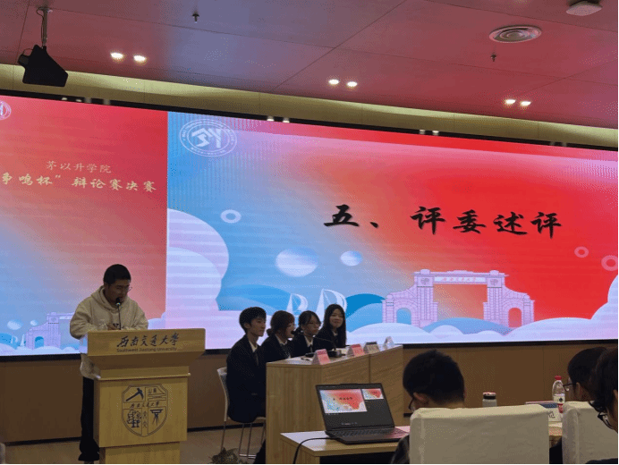 评委点评嘉宾对双方辩手表现进行点评。校辩论队队长张育恺和校辩论队团支书郁佳超从专业角度分析双方的辩论内容和技巧,对双方辩论战场进行仔细讲解和点拨。
