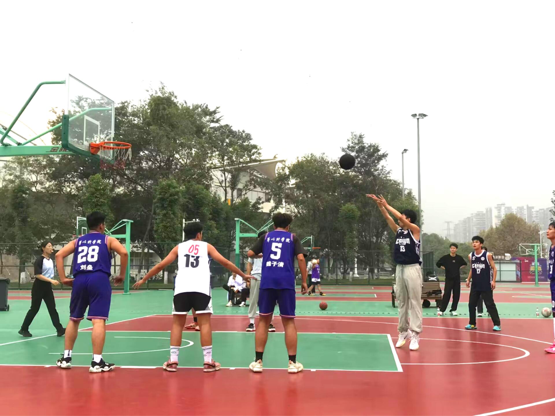 随着哨声响起,冠军争夺赛正式拉开帷幕。“大三大四联队”开场迅速展开进攻,10号球员常珈川快速反击,以一记漂亮的三分球率先为队伍拿下首分,点燃全场激情。“大二连联”则不甘示弱,30号球员徐松岩超凭借其娴熟的运球技巧和精准的投篮,回敬对手,场上比分交替上升,双方你来我往、互不相让,展现出强烈的拼搏精神。上半场结束时,“大三大四联队”以18:15稍微领先。