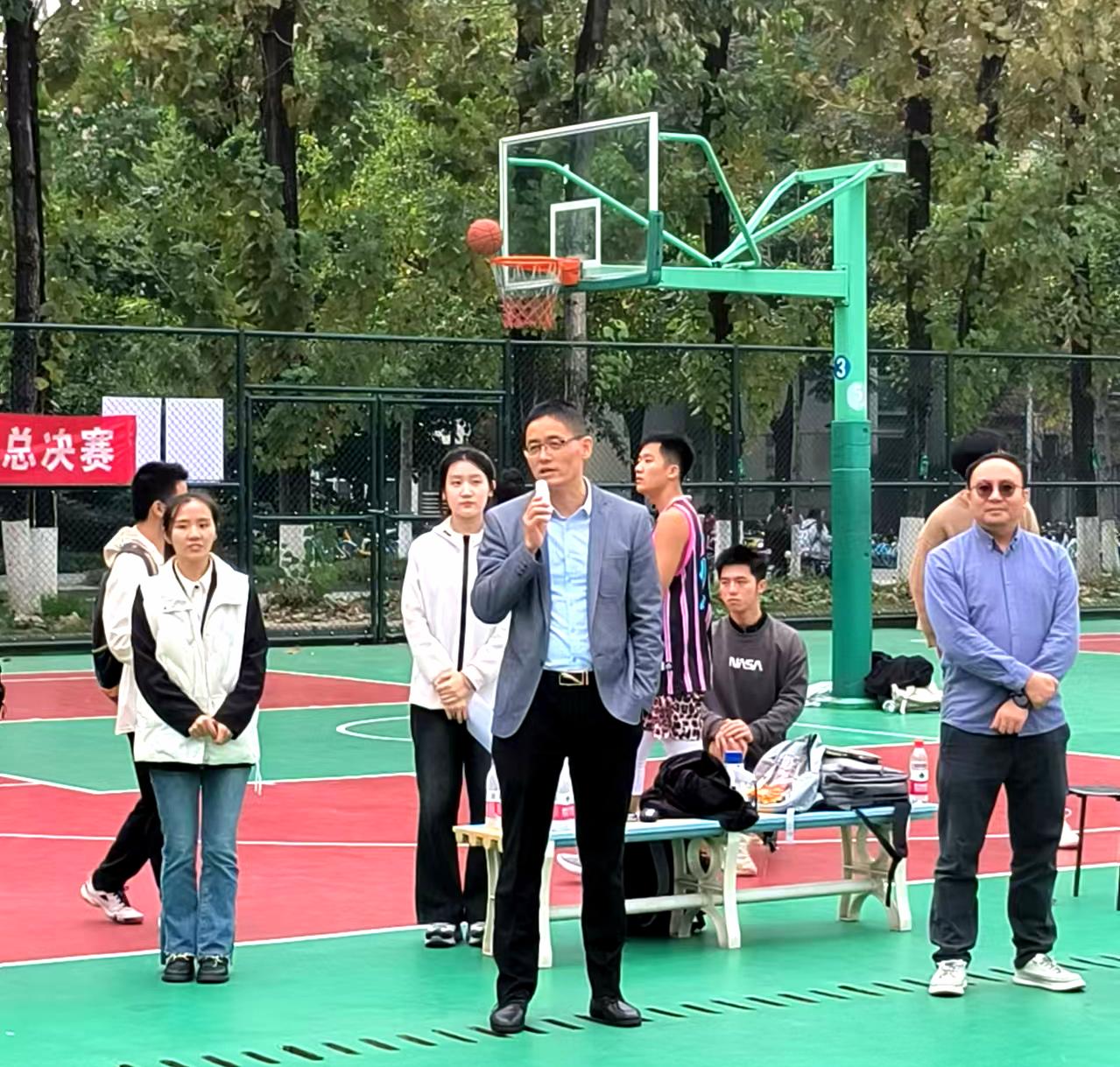 李毅为本次篮球决赛加油鼓劲。他指出篮球比赛不仅能锻炼同学们的体魄,增强团队合作意识,更是展现茅院精神风貌和青春活力的重要平台。他赞扬篮球健儿们在赛场上所展现的非凡拼搏精神与卓越竞技风貌,激励他们在本次比赛中全力以赴,赛出风格、赛出水平。