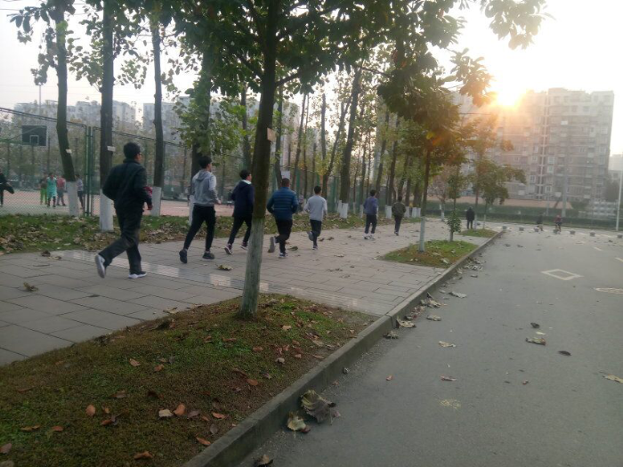 16:30,同学们准时在唐城书院门前空地集合,稍作准备活动,列队开跑。