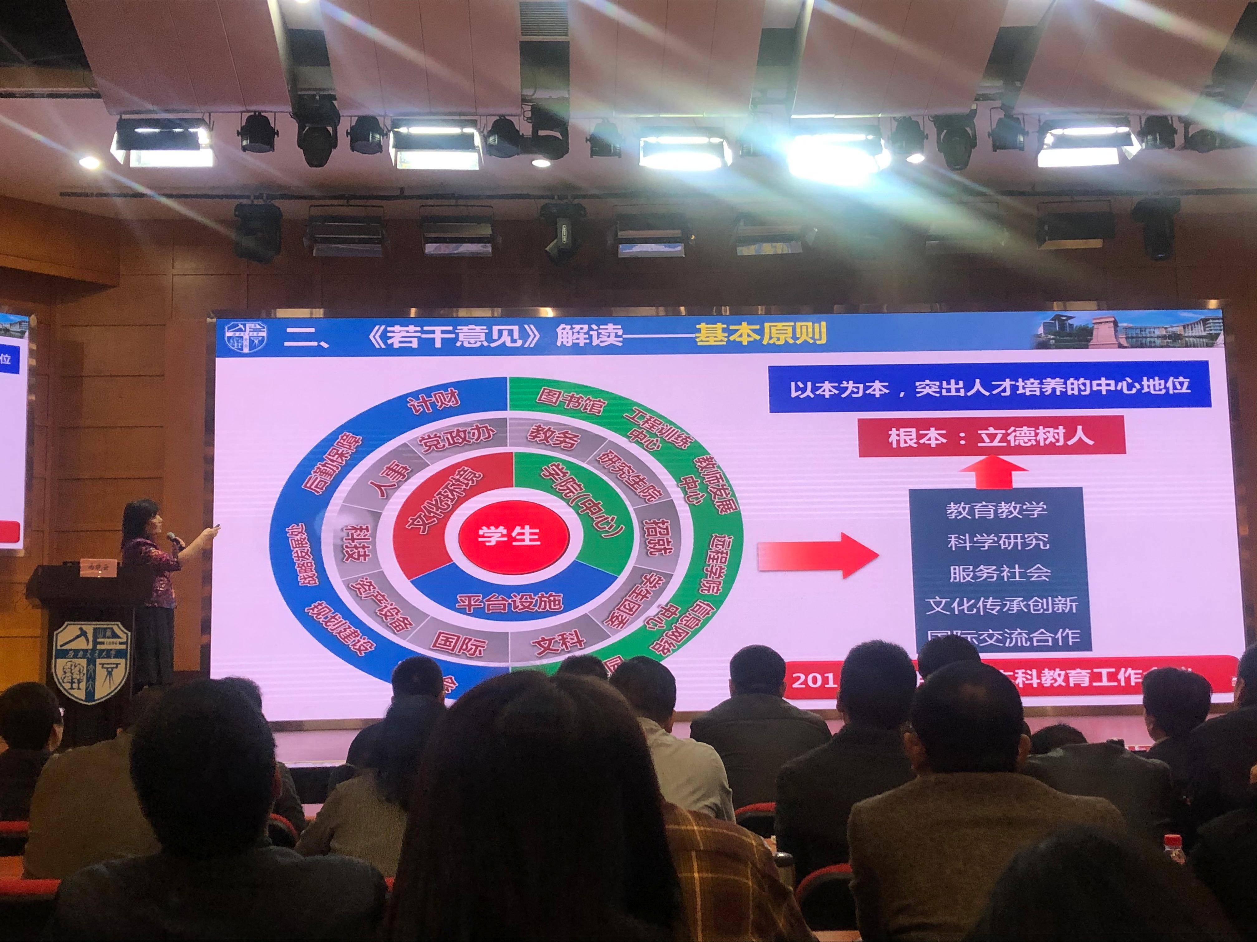 人才培养要求进行了阐述。她指出,新时代下应以建设中国特色、世界水平高等教育强国为总目标,要抓好建设德智体美劳全面发展的社会主义建设者和接班人的教育根本目标,创建一流大学。
