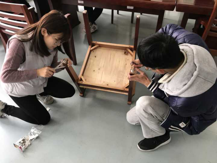 本次活动共分为两次完成,分别在11月27日和12月7日。在活动中,金融、中文团支部全员出动,每人备好活动所需的工具和消音所需的材料,进入图书馆后立刻按照团小组分工区域,井然有序、有条不紊地开始了本次公益活动。经过现场勘查,图书馆的椅子下方原有用钉子钉住的塑料消声垫,但由于年代久远和经常摩擦,原先的塑料消音垫不仅失去了效果,而且在拖动时会制造出更大的噪音。同学们采用各种办法,先把旧的塑料垫取下,再粘上新买的摩擦垫。每组成员分工明确、合作默契,并在活动的进行过程中总结经验,从而提高了工作的效率和质量,受伤的情况也很大程度上减少。同学们的工作态度认真严谨,在每次实践结束后都主动将垃圾收拾干净、座椅摆放整齐。