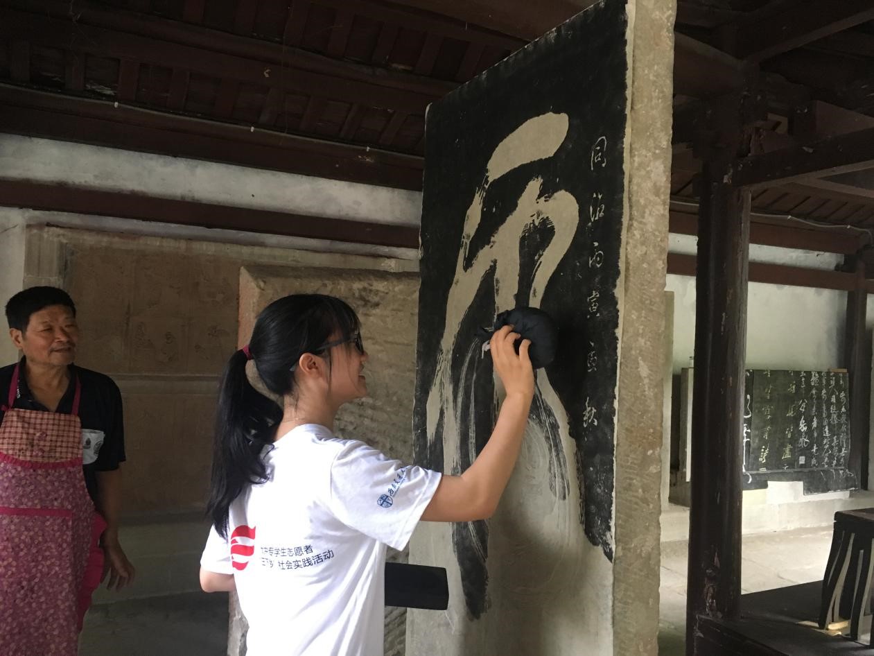 随后,我们来到了汉桓侯祠,又称张飞庙,除了参观了内部陈列,我们还遇到了一位做拓印的老手艺人,并参与制作了一次拓印,将保存尚好的石碑内容呈现在宣纸上。通过交谈,我们了解到,如今掌握这个手艺的人还是少数,在历史的进程中,总有一些珍贵的东西被我们悄悄遗忘,这一次的经历让我们第一次真正意识到了保护传统文化的紧迫性,古人的智慧结晶不该到我们手里就消失殆尽。