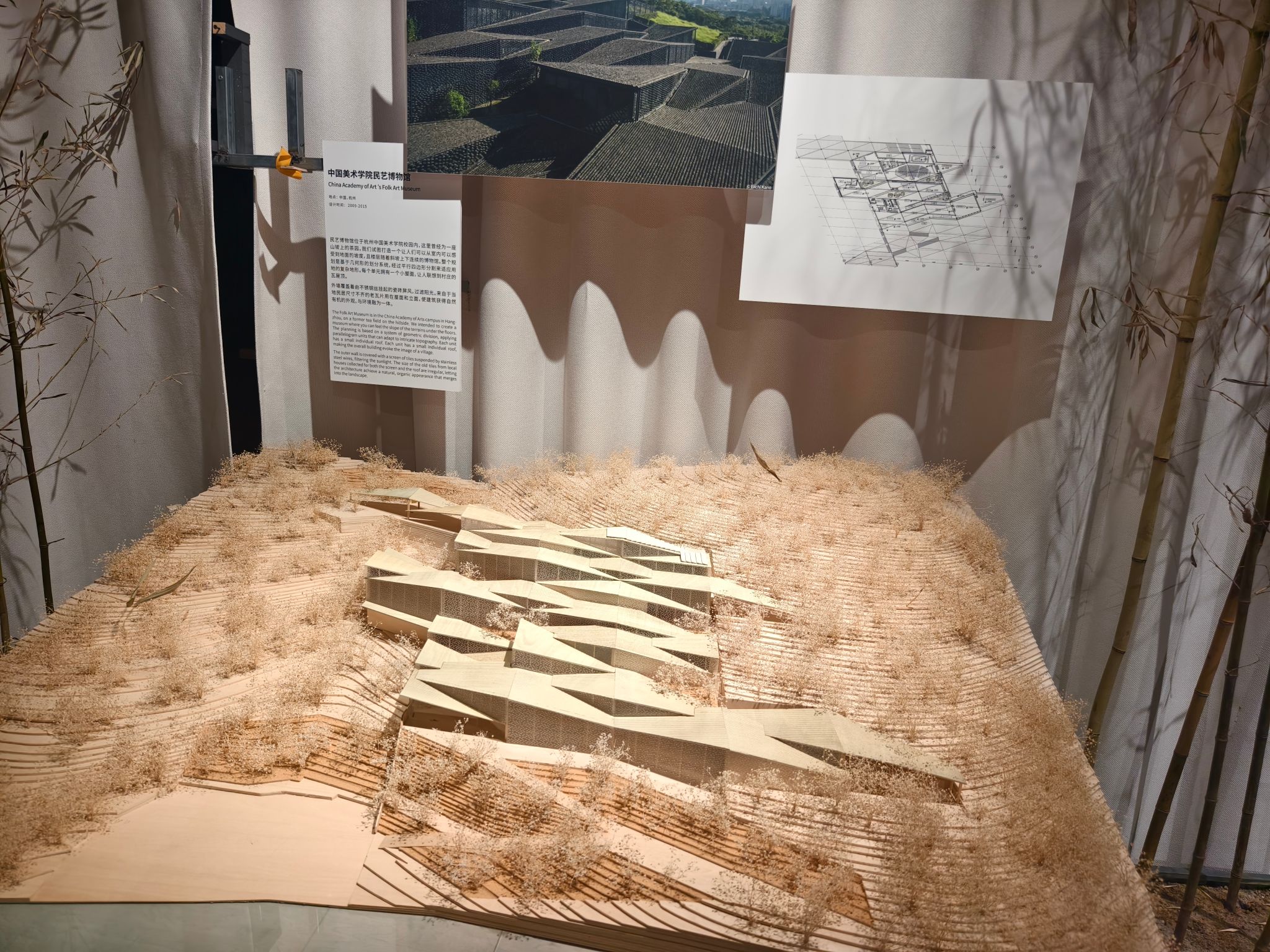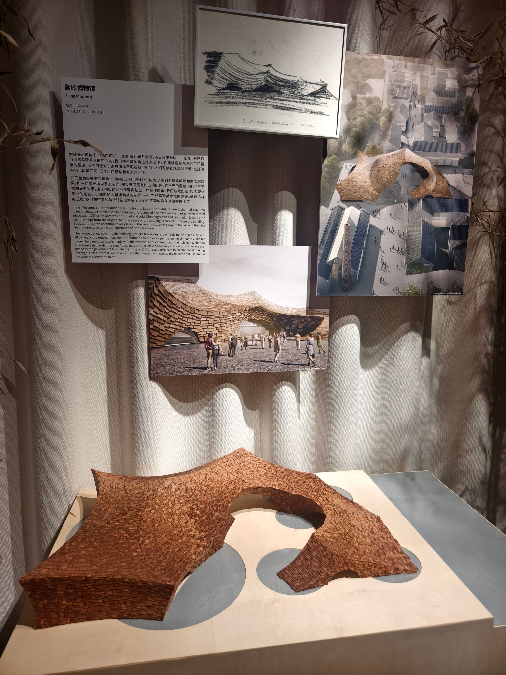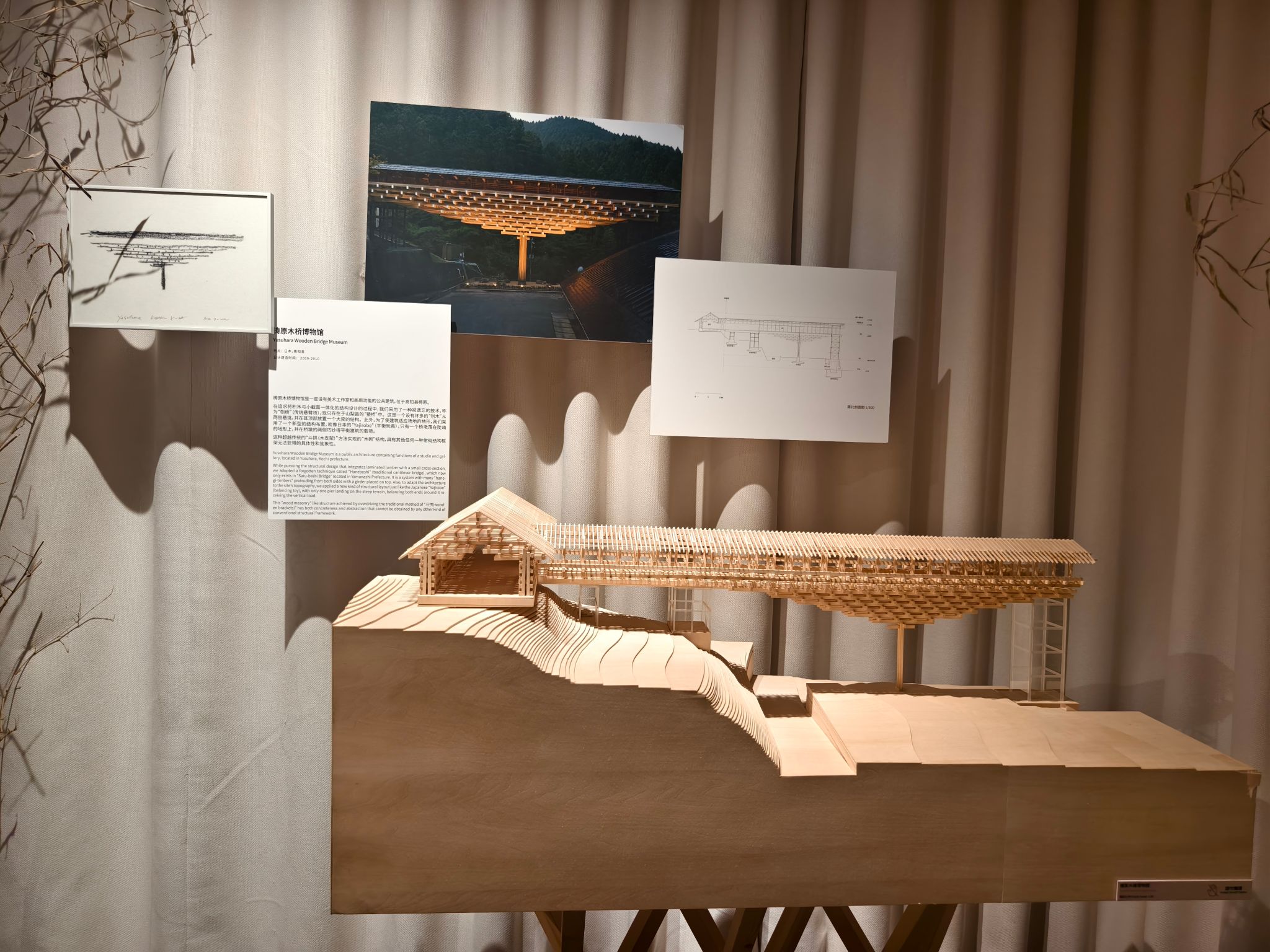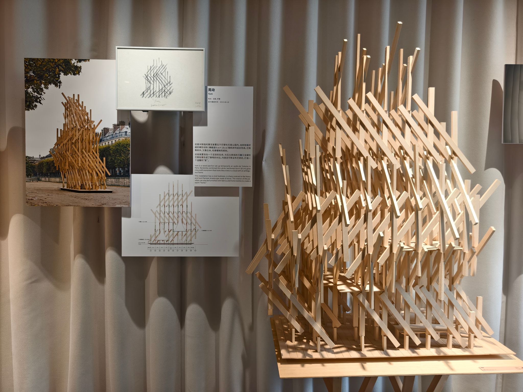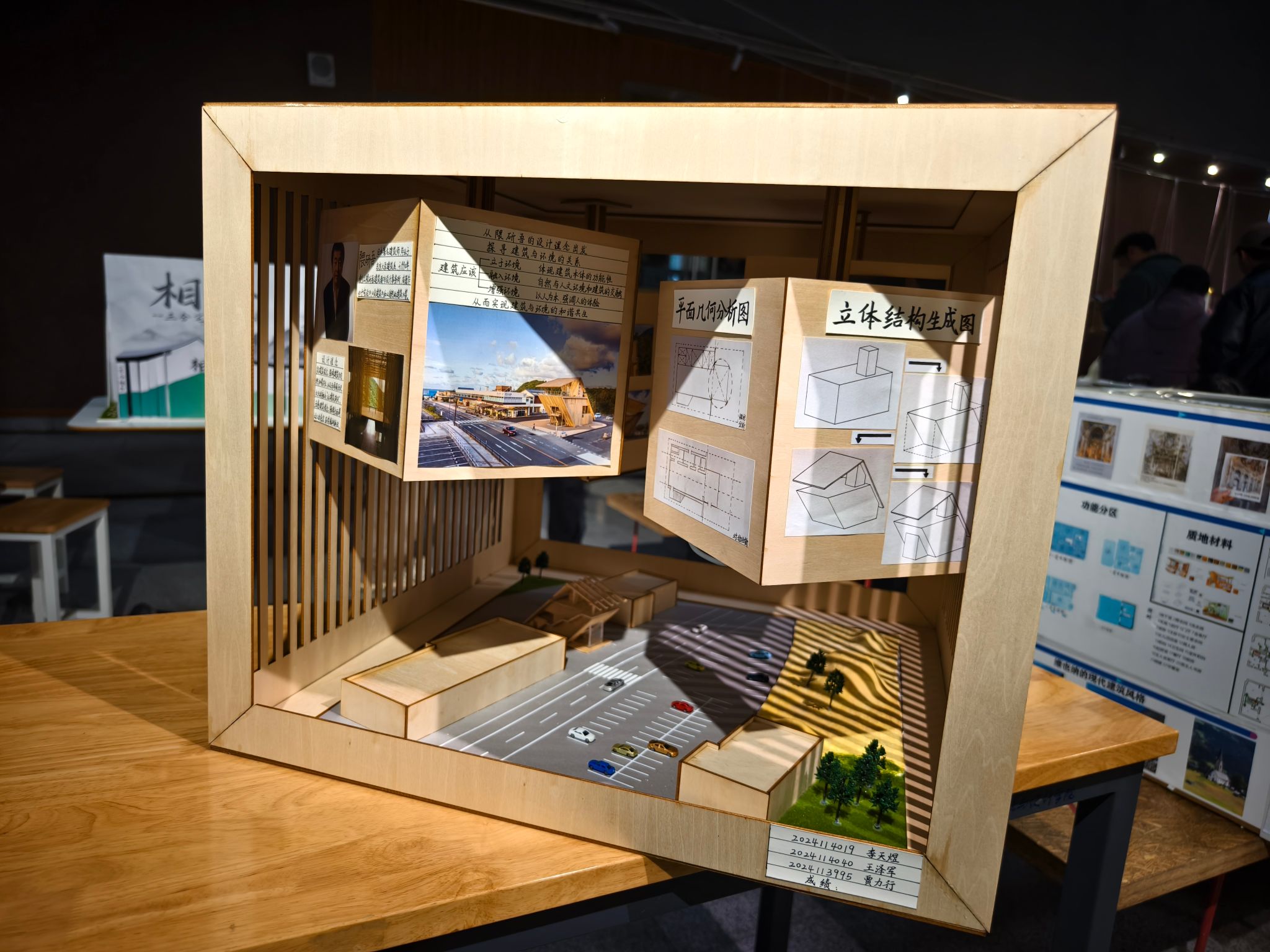 从经典案例模型和设计理念分析到现场强调的五感布展所带来的沉浸式体验,半小时的深入观展让我初步建构起了“理论-实践”的双向认知通道,课堂讲授的“模糊空间”概念在展览的茶室装置中具象化为竹帘筛落的光影剧场,教科书中的“材料叙事”理论在实木构件的肌理中娓娓道来……在观展中,专业知识便完成了从符号认知到具身认知的质变。这种跨越课堂内外的学习模式,恰似隈研吾建筑中“虚与实”的辩证关系——教室内提供理论骨架,而课堂外的体验赋予其血肉灵魂。