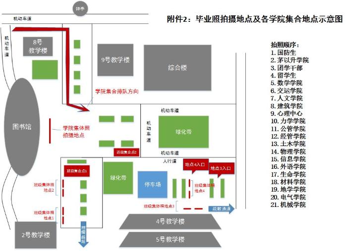 学生工作组安排毕业班辅导员组织毕业生按规定时间、规定队列,在规定地点完成集合,参加毕业照拍摄。(拍摄次序及拍摄时间见附件1;集合地点见附件2)
