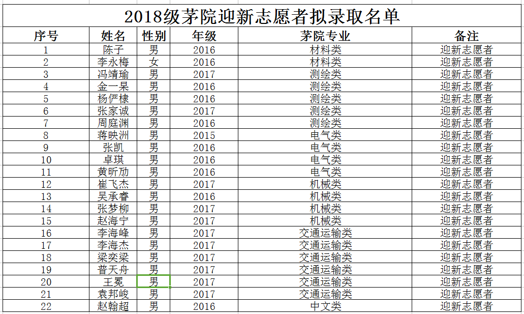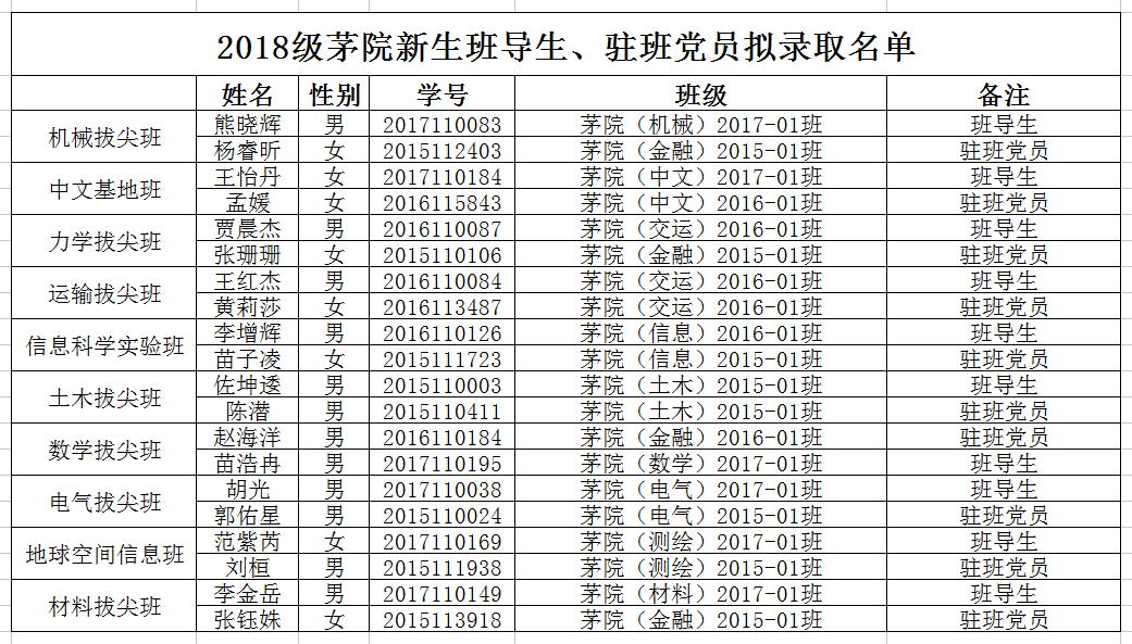 研究决定由以下同学担任2018级学生班导生、驻班党员和迎新志愿者职务,具体结果如下: