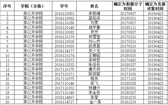 为进一步做好2019-01期入党积极分子培养发展工作,av影片直播 严格按照校党委要求,在av影片直播 党总支的领导下,经培养考察、民主推荐、党支部讨论确定,报校党委组织部审查批复,拟将李若靖等20位同学作为党员近期发展对象。为增强党员发展工作的民主程度和透明度,广泛接受群众监督,保证党员发展的质量,特公示如下: