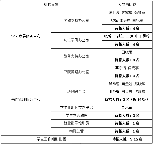 招聘岗位:学生兼职团委副书记1名,物资总管1名(负责老师:毛盾老师 X1118B),学生党务助理2名(负责老师:雷燕君老师 X1118A),就业指导培训员1名(负责老师:于雪婷老师 X1118B)。