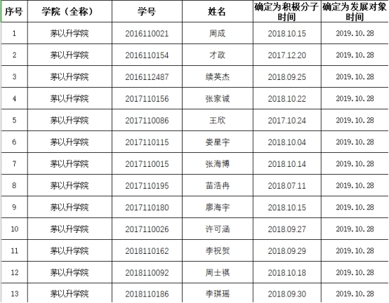 为进一步做好2019-02期入党积极分子培养发展工作,av影片直播 严格按照校党委要求,在av影片直播 党总支的领导下,经培养考察、民主推荐、党支部讨论确定,报校党委组织部审查批复,拟将周成等13位同学作为党员近期发展对象。为增强党员发展工作的民主程度和透明度,广泛接受群众监督,保证党员发展的质量,特公示如下: