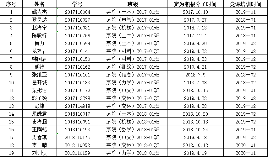 为进一步提高党员发展质量,切实做好党员发展对象的培养教育,av影片直播 严格按照校党委要求,在av影片直播 党总支的领导下,经培养考察、民主推荐、党支部讨论确定,拟将姚人杰等19位同学确定为2020-02期发展对象,参加党校培训。为增强党员发展工作的民主程度和透明度,广泛接受群众监督,保证党员发展的质量,特公示如下: