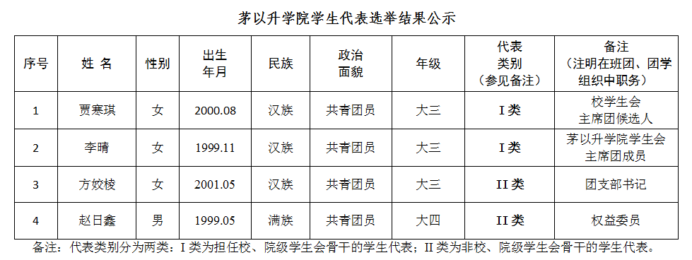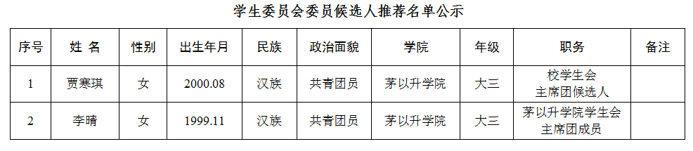 团组织考察,推选出学生委员会委员候选人2名。现将代表选举结果、委员候选人推荐名单公示如下。