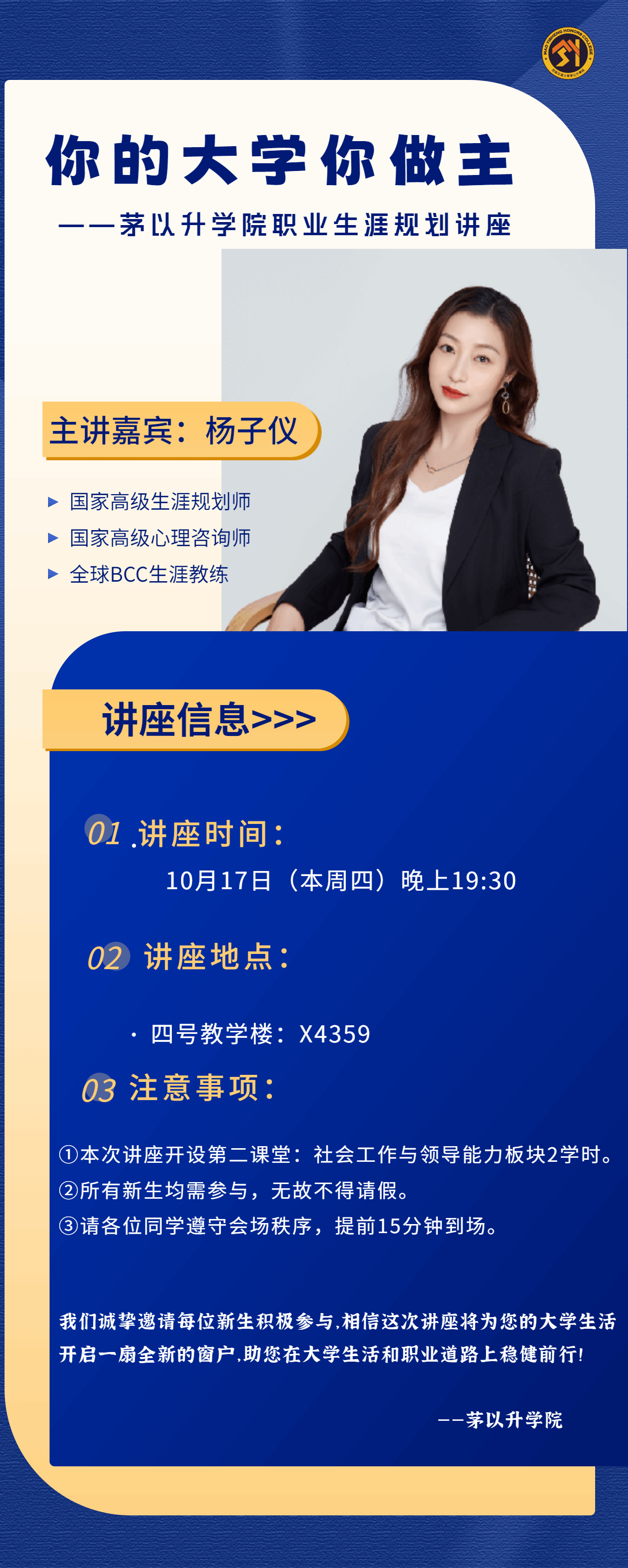 我们诚挚邀请每位新生积极参与,相信这次讲座将为您的大学生活开启一扇全新的窗户,助您在大学生活和职业道路上稳健前行!