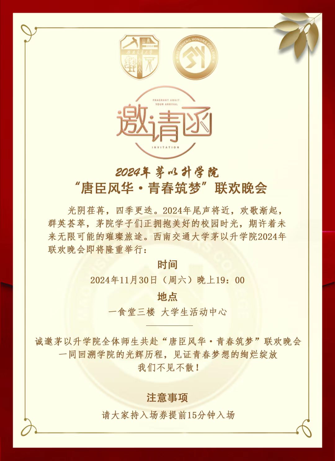 2024年11月30日(周六)晚上19:00,“av影片直播 风华·青春筑梦”2024年av影片直播 联欢晚会将于犀浦校区一食堂三楼隆重举行。在此,av影片直播 诚邀各专业av影片直播 老师,av影片直播 全体师生共襄盛举!