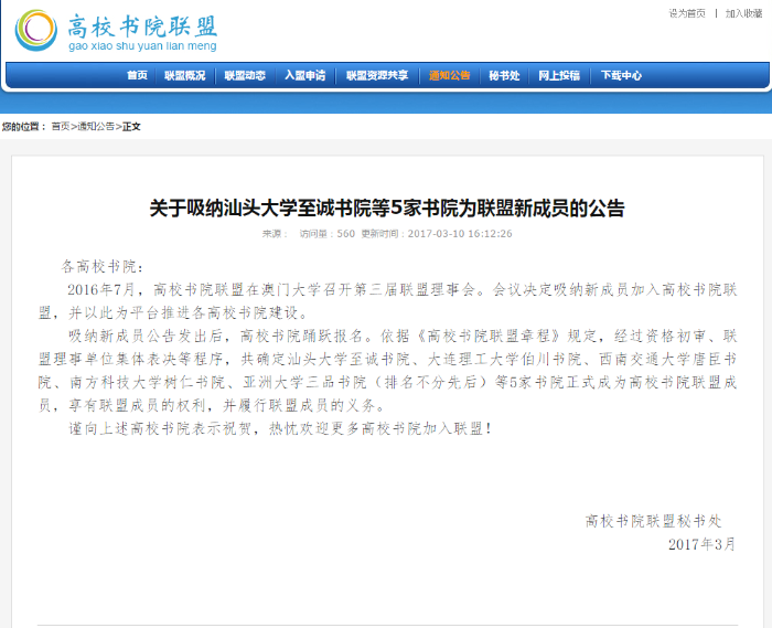 关于吸纳汕头大学至诚书院等5家书院为联盟新成员的公告