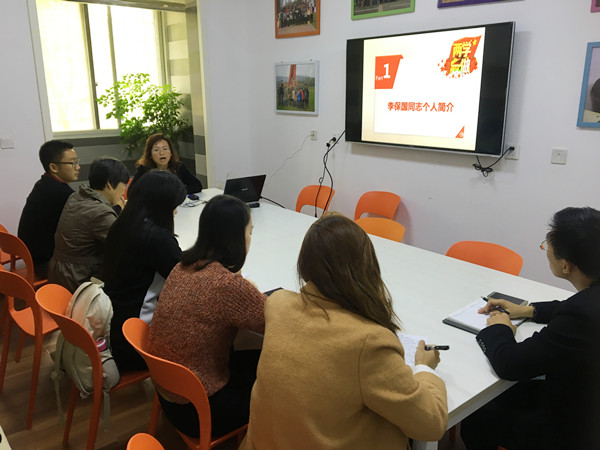 党总支委员、学生工作组组长王霞首先向大家详细讲述了李保国同志的先进事迹。我国知名经济林专家、山区治理专家、国务院政府特殊津贴专家、河北农业大学博士生导师李保国教授,因心脏病突发,猝然离世。李保国从一个学农爱农、积极要求进步的青年教师,逐步成长为一名优秀共产党员、山区综合治理专家,感受到他一心为民、无私奉献的报国情怀。他淡泊名利、无私奉献,总是为农户、企业无偿提供技术指导,既不拿工资,也不持股份,还时常自己搭路费。李保国是当代知识分子的优秀代表。30多年来,他在完成农大教育科学科研任务的同时,扎根太行山区,潜心服务人民,立志做“太行新愚公”;30多年来,他始终坚持走与人民群众相结合的道路,在服务人民中寻找和实现自身价值。30多年来,他始终坚持“生产为科研出题,科研为生产解难”的理念,把科学研究与生产实践紧密结合。30多年来,他始终把“三尺讲台”和“田间地头”紧密结合,他主讲的课程生动、形象,实践性强、接“地气”,深受学生欢迎。