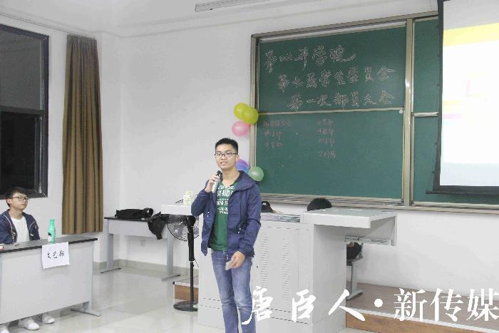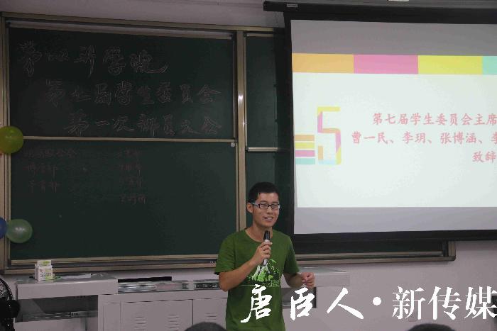 听完毛老师的谆谆教诲,第六届学生会主席邹宝宝被邀请上台,与同学们分享他在学生会的经历。邹宝宝主席首先欢迎各位同学加入学生会这个和谐友爱的大家庭,大一是很多新生感到迷惘、徘徊的时期,同学们应该为自己定下目标,合理安排好自己的大学生活;学生会的活动比较多,加上繁重的课业,很多同学慢慢就会失去激情,邹主席希望同学们能带着不变的热情一直走下去!