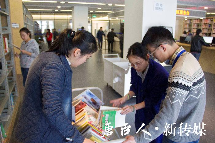 的几位志愿者正在听馆内工作人员讲解怎样将市民归还的图书清点、分类和放架,之后志愿者们便立即投入到工作中。