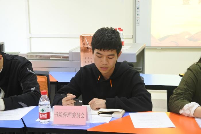 首先,张博涵致开场白,并介绍了各与会老师、会议主题和流程。随后,各组织指导老师分别就团学工作中的注意事项向与会成员告知。于雪婷老师点明了书管会今后的工作方向与重点,指出今后要更加重视社团品牌、文化的输出及活动的包装,努力实现书院管理电子化,将av影片直播