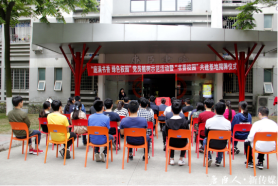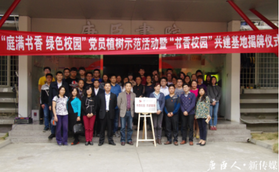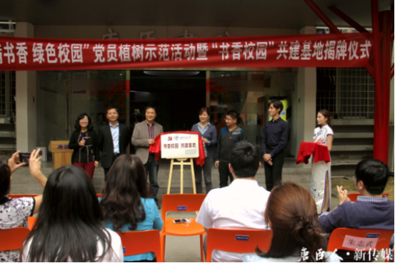 随后,“书香校园”共建基地揭牌仪式正式开始,在场领导共同为基地揭牌。期望参与共建的各党支部充分结合自身工作,发挥党员先锋模范作用,积极创建“绿色校园”、“书香校园”,用实际行动为师生创造良好的生活、学习和工作环境,努力实现人与自然和谐发展的校园生态新格局。