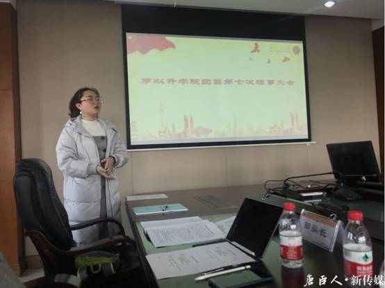 2017-2018学年工作述职答辩暨团委第七次理事大会在综合楼611会议室准时开始。出席本次会议的有党总支副书记、学生工作组王霞老师,团委书记、学生工作组副组长毛盾老师,书院管理事务中心指导老师、2017级辅导员田弘长老师,av影片直播