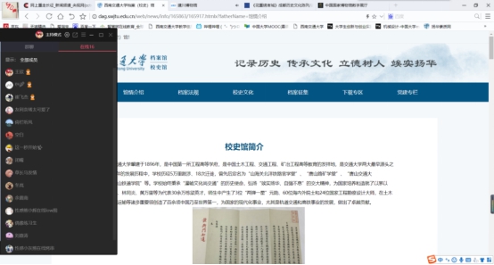 2020年9月14日下午,茅院(机械)2017-01团支部召开“青春的我,信仰的光”主题团课,此次团课旨在通过参观云“博物馆”开展“四史”学习教育活动。本次活动由团支部书记王欣主持,支部全体成员参与。