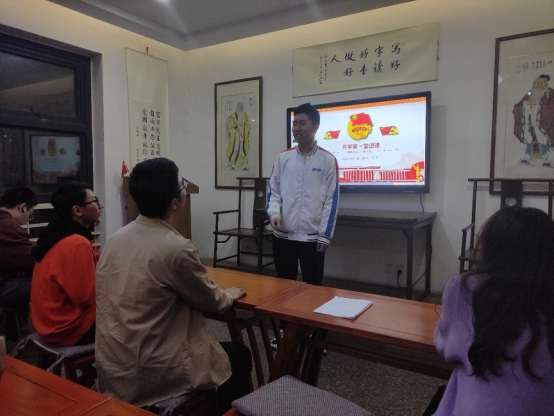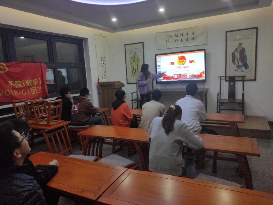 茅院(数学)2018-01团支部在2020年10月11日晚8:00于天佑斋21栋二楼勤学厅开展了开学第一次团课。全班14名团员到场12人,主持人团支书何一凡同学以演讲的形式开展了本次活动。本次活动总时长为1小时。加深了同学们对共青团,共产党的认识。