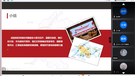 最后,刘珈雯同学向大家讲解了四川各个城市对成渝地区双城经济圈建设所作出的贡献,以及作为青年人的我们能对经济圈的建设做出哪些贡献,成渝地区双城经济圈的建设又为我们年轻一代提供了哪些新兴的机遇。