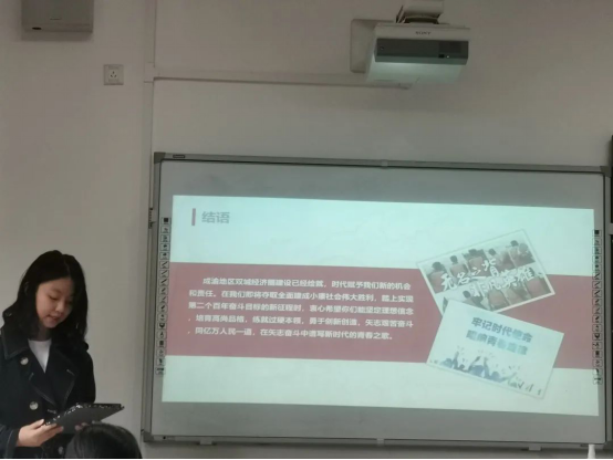 最后,团支书张翔同学带领同学们展望了成渝双城经济圈打造新高地,共赢新发展的美好蓝图,介绍了当下已经拉开大幕的建设计划,号召大家坚定理想信念,与时代共呼吸;站稳人民立场,与社会共命运;练就过硬本领,与榜样共进步;投身强国伟业,与祖国共绽放,谱写新时代青春之歌。