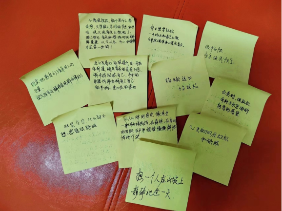 活动共有八项环节,第一环节——音乐按摩,让同学们闭上眼睛,感受音乐带给的惬意,通过沉寂心灵,让音乐走进大家的心里,轻拂一身的疲惫,洗涤沉重的心灵,慢慢放缓呼吸、放松身体、放空思绪、渐渐入定,将身心融化在空灵的音乐意境中。接着第二环节——释放焦虑,甘老师将体验的同学们分为两组,请每个同学从纸盒中拿一张纸条,并在空白纸条的一面,用一句话写下长久困扰自己的焦虑,写好后折叠纸条投入各组的心灵盒中,然后两组交换。活动的第三环节为主导环节——心灵律动,音乐治疗助手为十六名体验的同学分发了奥尔夫乐器,在甘老师教导使用后,由老师主奏,同学们跟着甘老师演奏的节奏,根据自己的感觉和基本的节奏逐渐加入合奏,先是激情之曲,再是温柔之曲,并伴以单音“u”的吟唱释放烦恼和压力,随后同学们在《深爱》的背景音乐中跟随节奏自由演奏奥尔夫乐器。