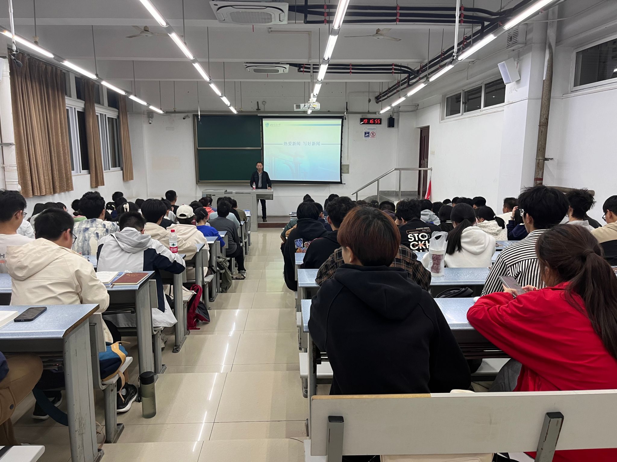 党委宣传部文化建设科科长阮琦以“热爱新闻、写好新闻”为主题讲授训练营第一课。阮老师以其深厚的学术造诣和丰富的实践经验,深入浅出地讲解了新闻稿写作的基本要领和技巧,包括如何选题、如何采访、如何撰写等关键环节。同时,他还分享了自己在新闻领域的丰富经验和成功案例,鼓励学生们积极投身新闻事业,用文字记录时代、传递正能量。阮老师的精彩分享赢得了在场师生的阵阵掌声。
