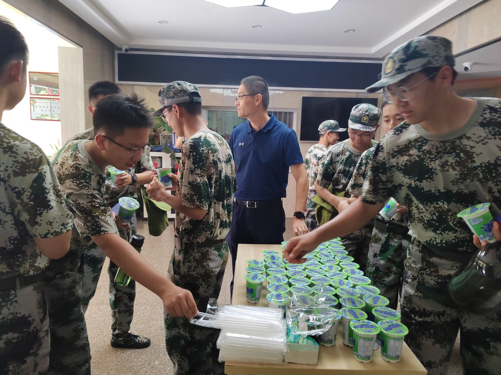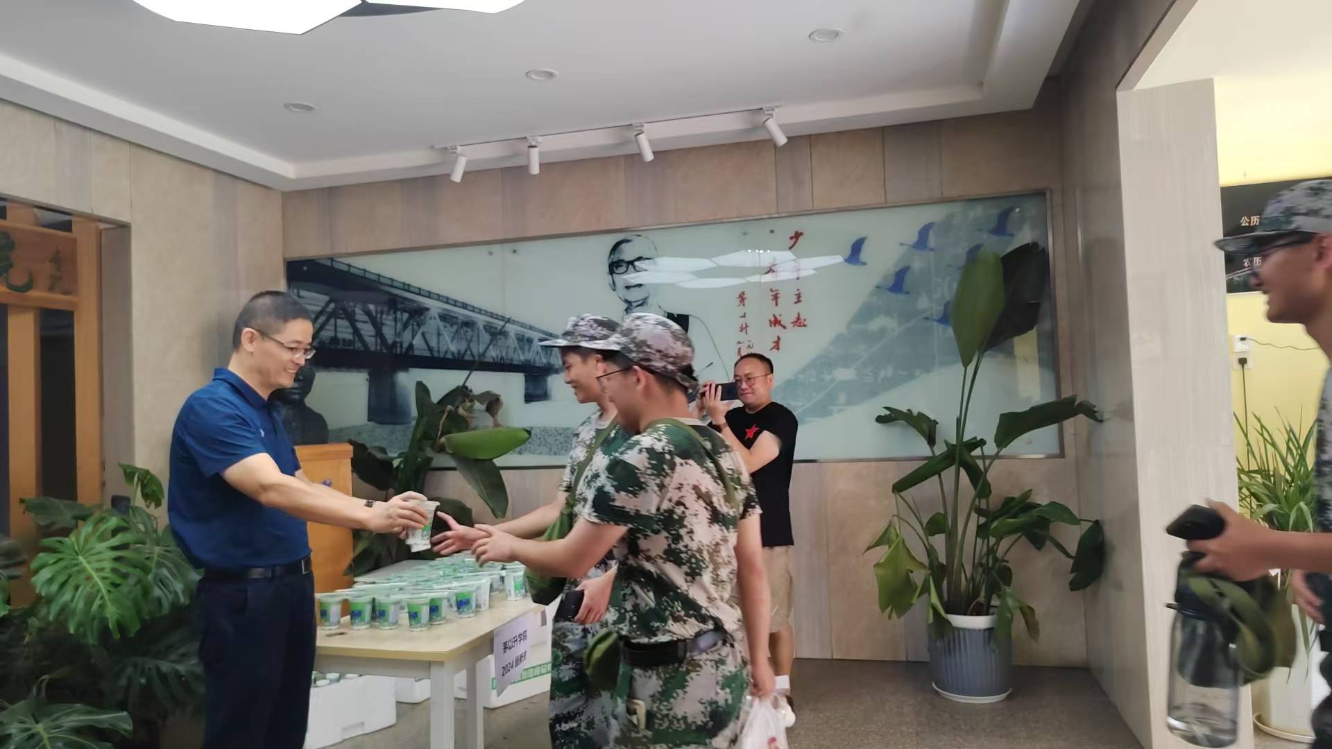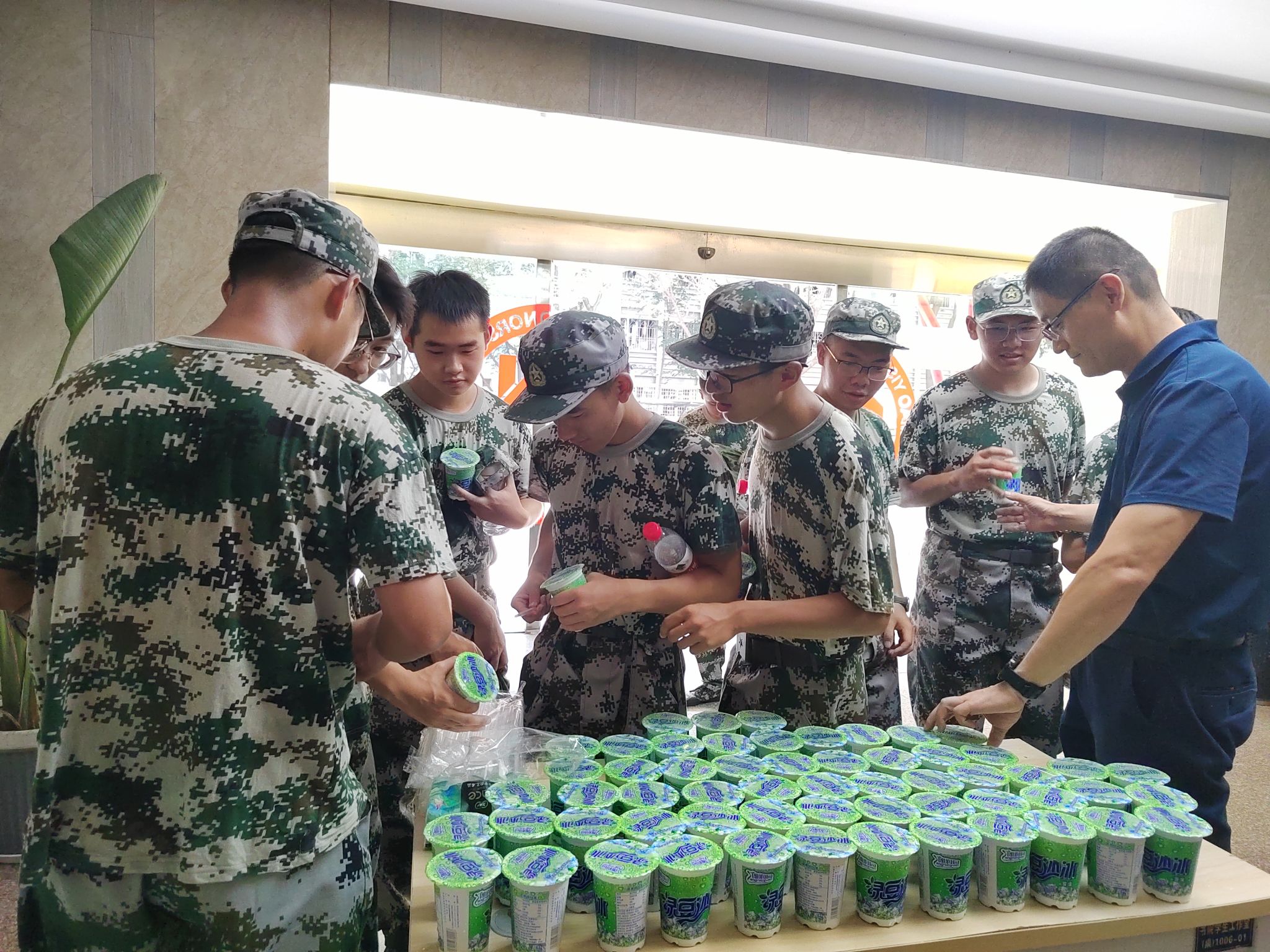 上午军训结束,av影片直播 大一新生陆续回宿舍,在av影片直播 书院一楼大厅,av影片直播 领导与老师们亲自上阵,将一份份冰凉的饮品递到每一位新生手中,并亲切询问他们的身体状况,鼓励他们继续保持良好的精神状态,圆满完成军训任务。每一杯绿豆冰沙都蕴含着av影片直播 对新生们的深情厚爱与殷切期望。这些解暑饮品不仅能够有效缓解学生在烈日下的疲惫与燥热,更是av影片直播 对学生们坚持与努力的肯定与鼓励。