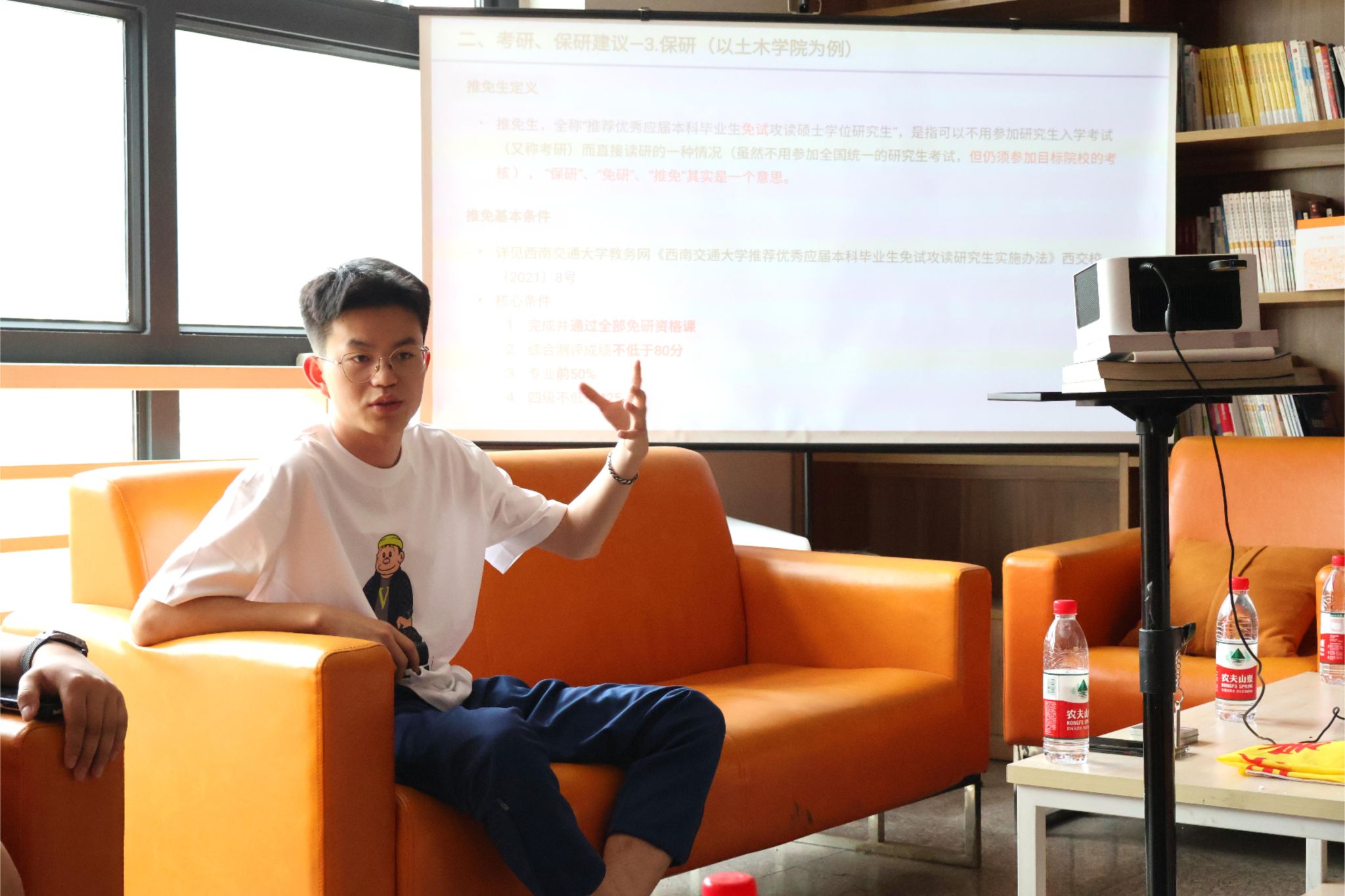 在保研考研介绍环节,王晓波精心准备,通过图表结合的方式,将复杂的信息直观呈现。从考研的学习规划、时间安排到备考策略,以及保研的相关政策、系统知识到注意事项,他都进行了细致入微地讲解。同时,他还结合身边同学的成功案例,让分享内容更具代入感与参考价值。