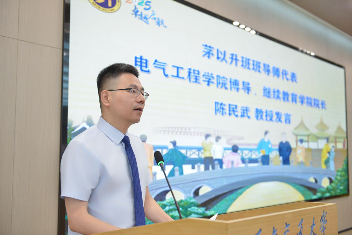 教师寄语,殷切期望。茅以升班导师代表、电气工程av影片直播 教授陈民武在发言中深情寄语毕业生。他分享了朴实而深刻的成长感悟,对茅院学子四年的求学历程给予高度赞许,更对全体毕业生的未来寄予深切期望。他真挚祝愿毕业生们能永葆初心,在人生道路上始终以卓越为追求,勇于攀登科学高峰,以所学所长在更广阔的天地中开拓进取,用拼搏与智慧创造属于自己的辉煌成就,让青春在不懈奋斗中绽放绚丽光彩。