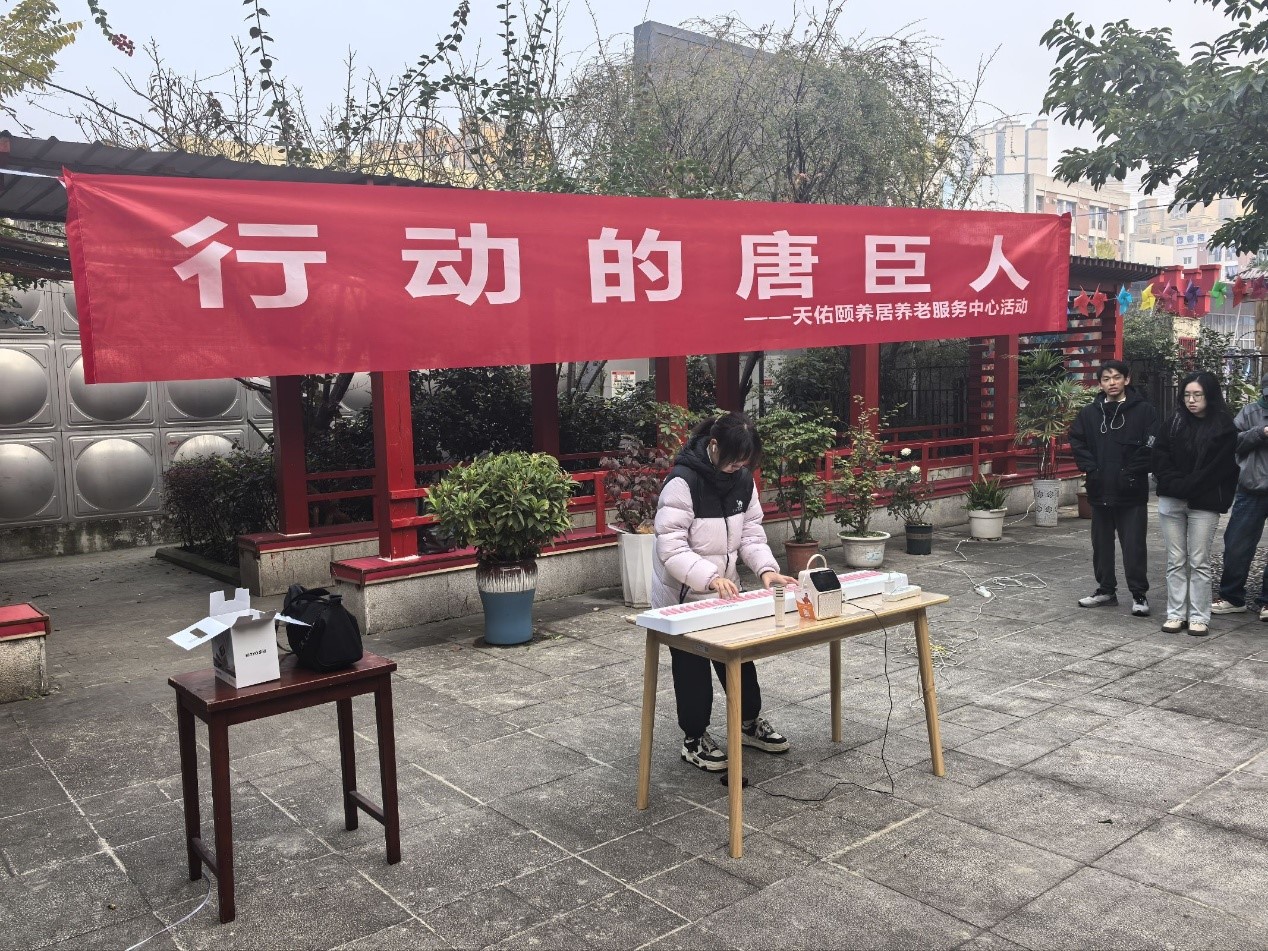 第二环节的才艺表演环节将活动气氛推向高潮。社团志愿者们精心准备了丰富多彩的节目,电子琴独奏悠扬婉转,熟悉的旋律唤起了老人们的青春记忆,志愿者们以饱满的热情、真挚的情感投入表演,赢得了老人们的阵阵掌声。老人们听得入神,不时跟着哼唱,眼中闪烁着感动的光芒。对于志愿者而言,看到老人们的笑容,所有的付出都变得值得,大家深刻体会到,才艺不仅是自我展示的方式,更是传递温暖、连接情感的桥梁。