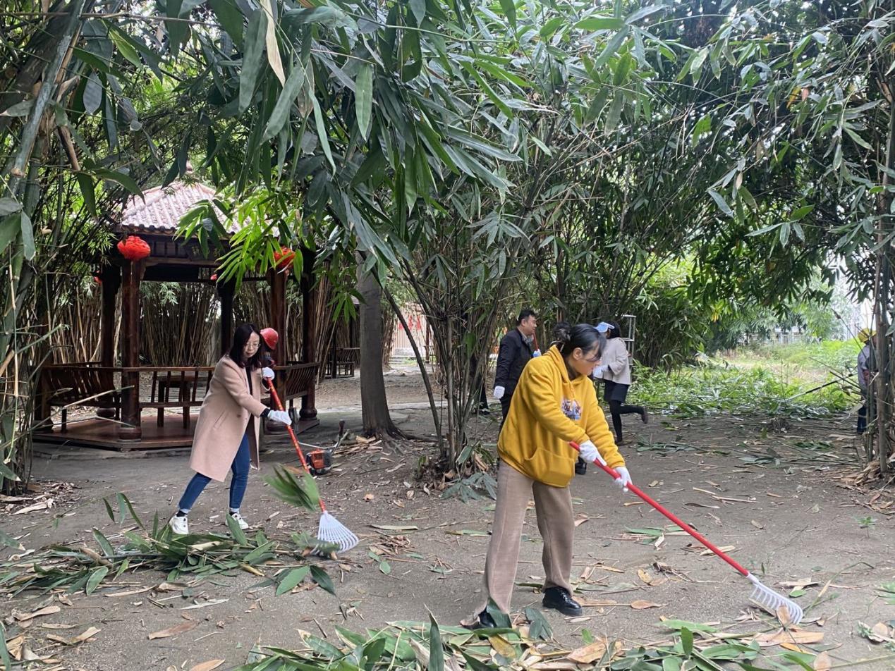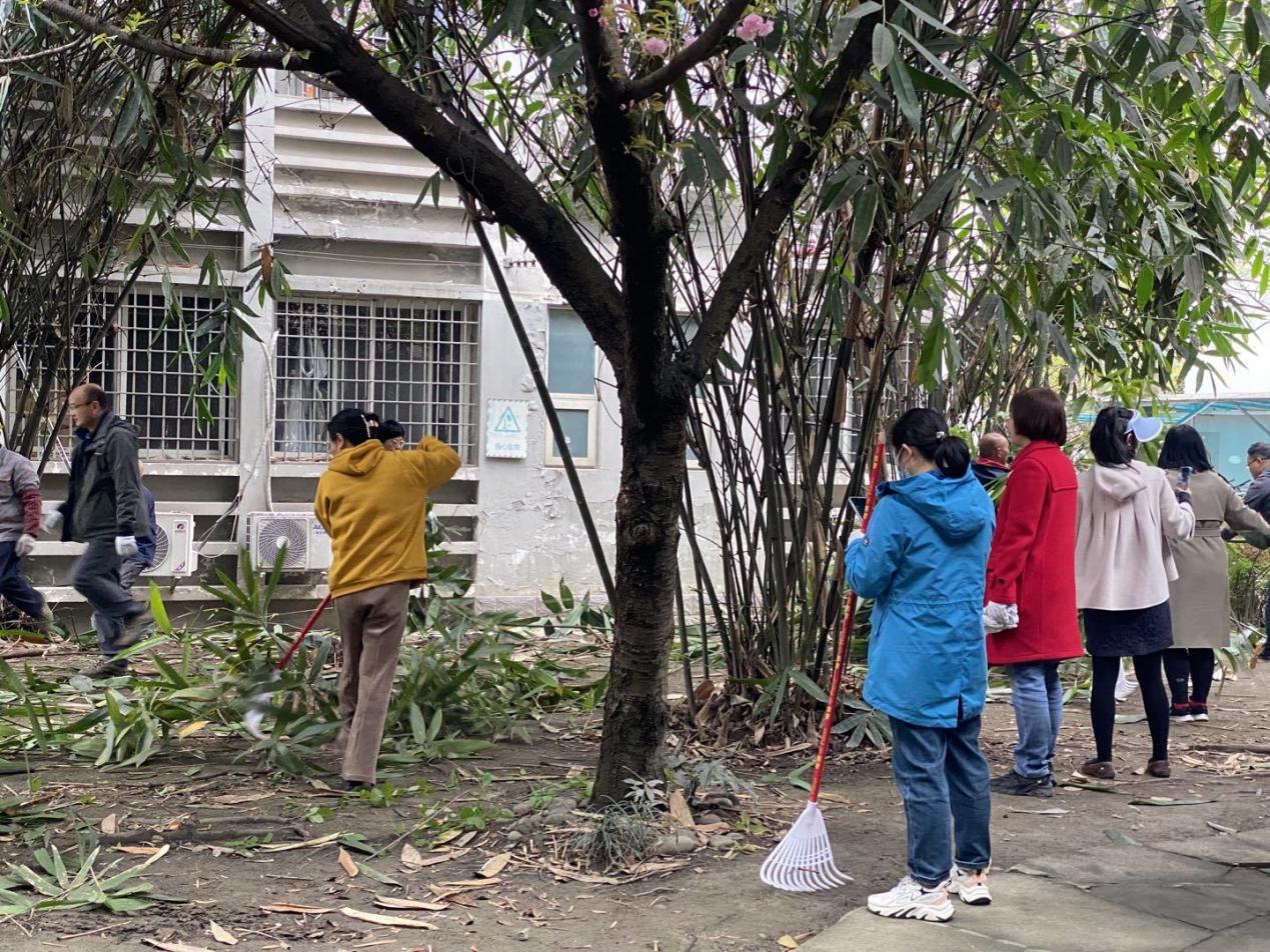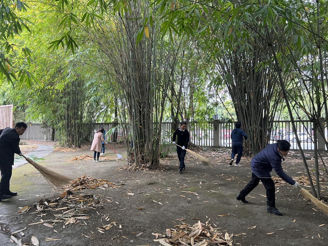 本次主题党日活动内容为“筑梦园”一站式服务育人教工党员示范劳动实践,在劳动实践活动中,党员同志们手持各种工具,耙落叶、扫垃圾、清道路……同时,齐心协力将筑梦园花圃中丛生的杂草铲除,对竹树花草进行修剪整理,并协助工人师傅将枯枝杂物运送上车。经过大家的共同努力,筑梦园沉积的冗枝和遍地的落叶被尽数清理,整个筑梦园整洁有序,富有生气,焕然一新。