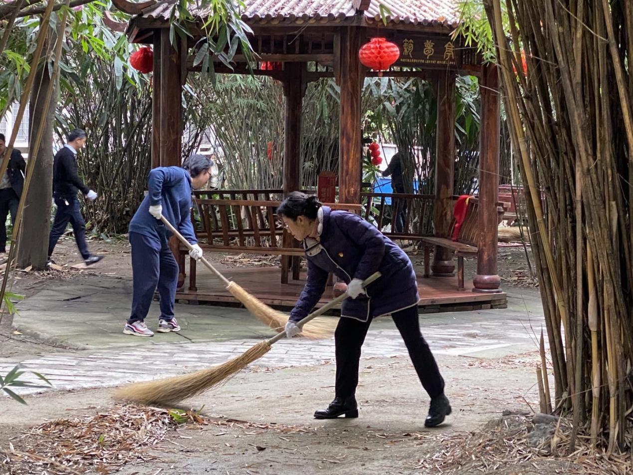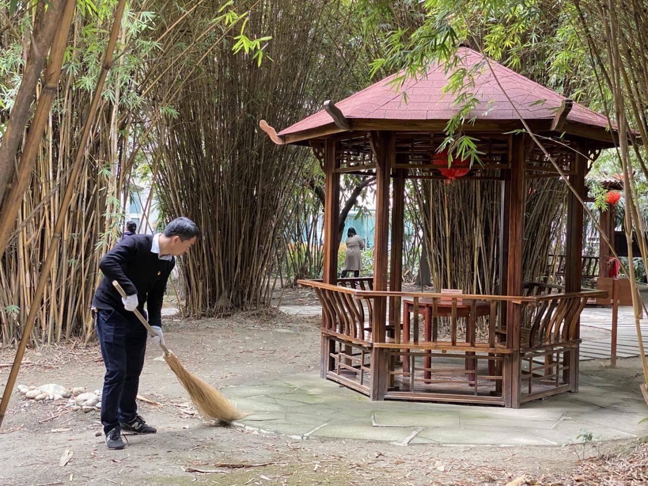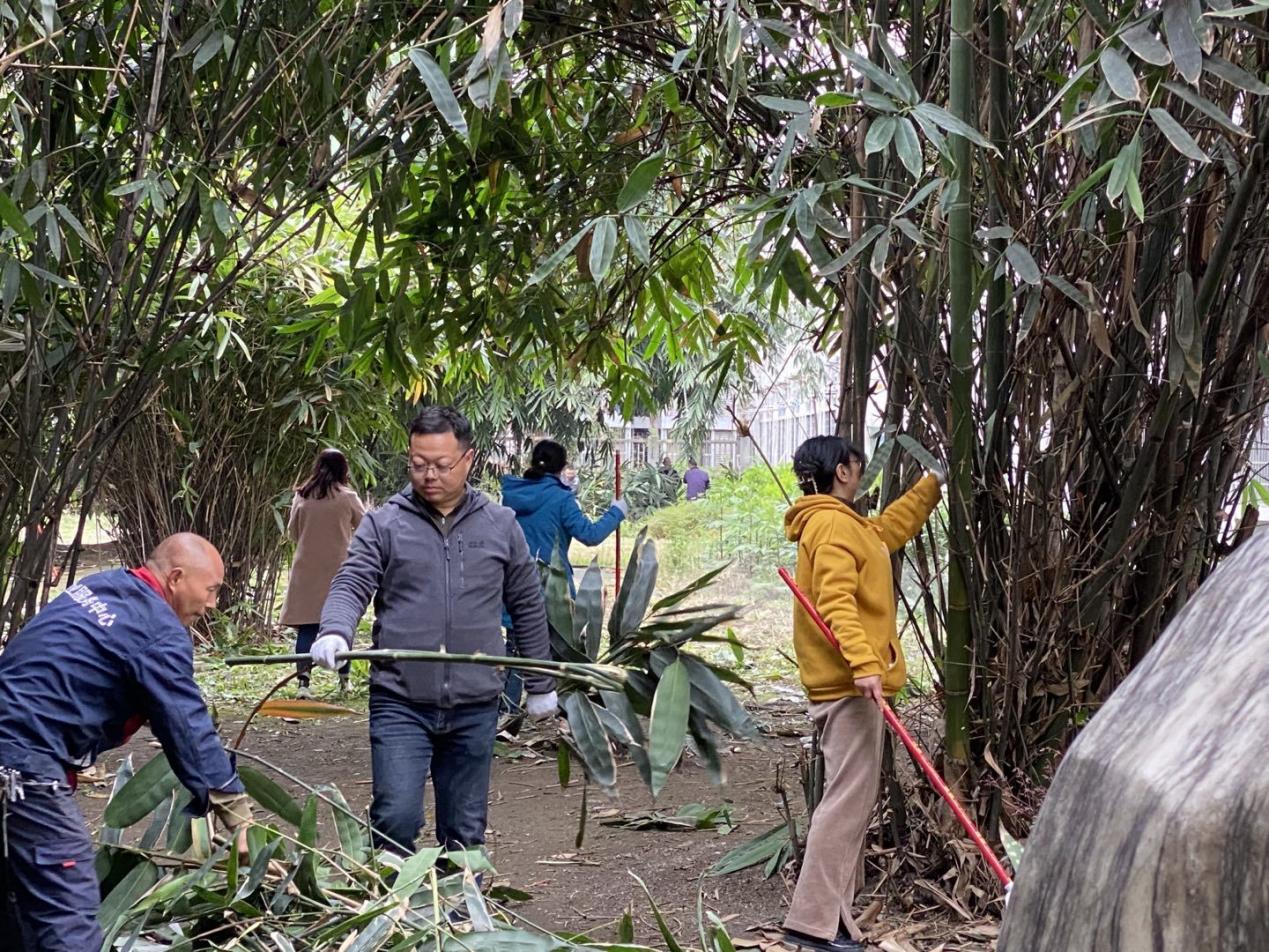 本次主题党日活动内容为“筑梦园”一站式服务育人教工党员示范劳动实践,在劳动实践活动中,党员同志们手持各种工具,耙落叶、扫垃圾、清道路……同时,齐心协力将筑梦园花圃中丛生的杂草铲除,对竹树花草进行修剪整理,并协助工人师傅将枯枝杂物运送上车。经过大家的共同努力,筑梦园沉积的冗枝和遍地的落叶被尽数清理,整个筑梦园整洁有序,富有生气,焕然一新。